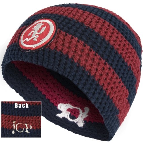 This black and red crochet knit beanie hat features the Insane Clown Posse's logo on one side and their Hatchetman logo on the other. Read more...