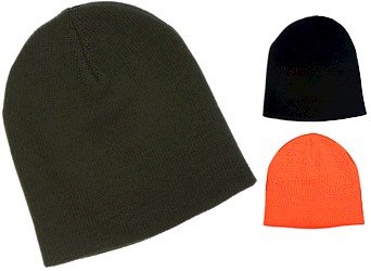 Acrylic jersey knit beanie in Black, Navy, and Neon Orange. Read more...