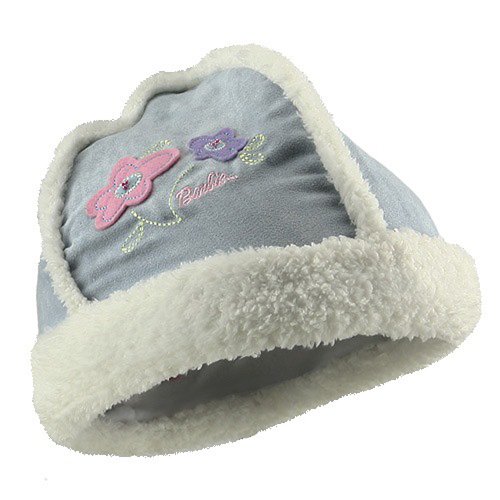 Your little Barbie lover will not want to get out of this super soft faux shearling hat. The hat looks to be made of baby blue suede with white shearling cuff and seams, with suede flower trims stitched into the crown. Not only will you love the look, but you will love the super soft feel of this adorable hat. Made of 4 panels with a 2-1/2 cuff, the hat can be easily adjusted by manipulating the cuff. This double layered hat will surely see your child from the cool days of fall to the end of a cold winter. Made of 100% polyester. Measures 6 deep, 9 wide. Fully lined with fleece. Comes ONE SIZE, for years 3-6 Officially licensed Barbie product. Also comes in pink and lilac. Read more...