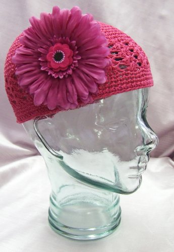 4" pink daisy attached to a soft and stretchy knit crochet beanie. The flowers center features a 1" pink felt flower with a brown center. The hat is available in sizes newborn to young girls. Read more...